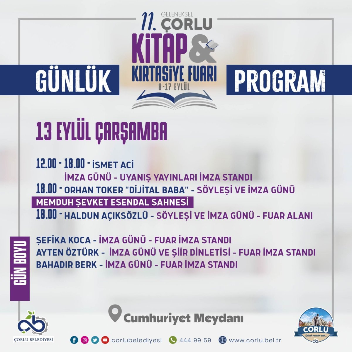 Kitapseverler ile edebiyat dünyasının bir araya geleceği, ailelerin çocukların okul ihtiyaçlarını giderebilmek için kırtasiyelerle buluşacağı 11. Geleneksel Çorlu Kitap ve Kırtasiye Fuarı, 8-17 Eylül 2023 tarihleri arasında Cumhuriyet Meydanı’nda gerçekleştirilecek.