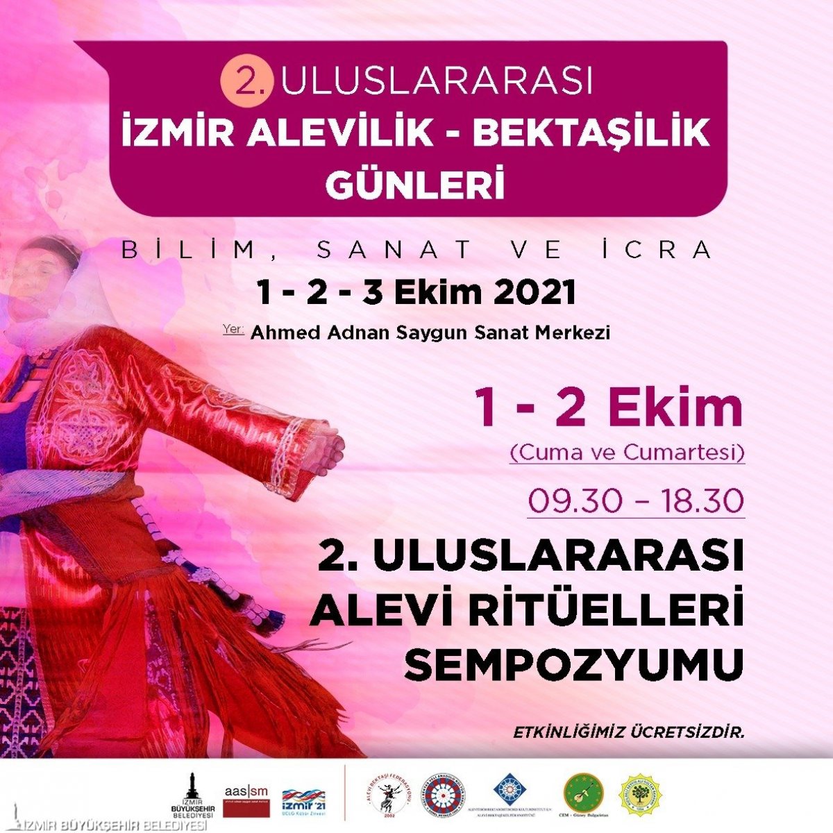 İzmir Büyükşehir Belediyesi tarafından ikincisi düzenlenen Uluslararası Alevilik Bektaşilik Günleri 1-3 Ekim 2021 tarihleri arasında ücretsiz ve halka açık olarak Ahmed Adnan Saygun Sanat Merkezi’nde yapılacak.