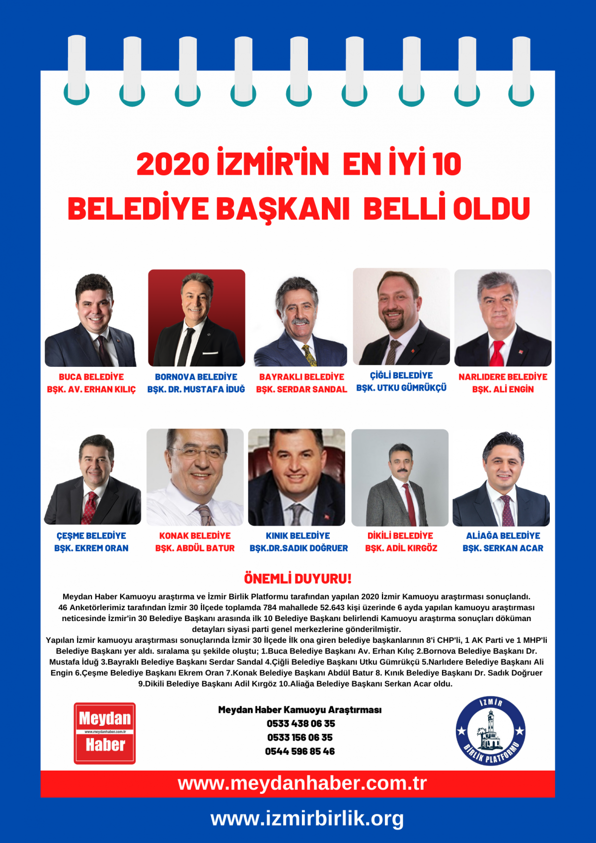 Yapılan İzmir kamuoyu araştırması sonuçlarında İzmir Büyükşehir Belediye Başkanı Sayın Mustafa Tunç Soyer'e Onur Ödülü verilirken İzmir 30 İlçede İlk ona giren belediye başkanlarının 8'i CHP'li, 1 AK Parti ve 1 MHP'li Belediye Başkanı yer aldı. Sıralama şu şekilde oluştu; 1.Buca Belediye Başkanı Sayın Av. Erhan Kılıç 2.Bornova Belediye Başkanı Sayın Dr. Mustafa İduğ 3.Bayraklı Belediye Başkanı Sayın Serdar Sandal 4.Çiğli Belediye Başkanı Sayın Utku Gümrükçü 5.Narlıdere Belediye Başkanı Sayın Ali Engin 6.Çeşme Belediye Başkanı Sayın Ekrem Oran 7.Konak Belediye Başkanı Sayın Abdül Batur 8. Kınık Belediye Başkanı Sayın Dr. Sadık Doğruer 9.Dikili Belediye Başkanı Sayın Adil Kırgöz 10.Aliağa Belediye Başkanı Sayın Serkan Acar oldu. www.meydanhaber.com.tr
