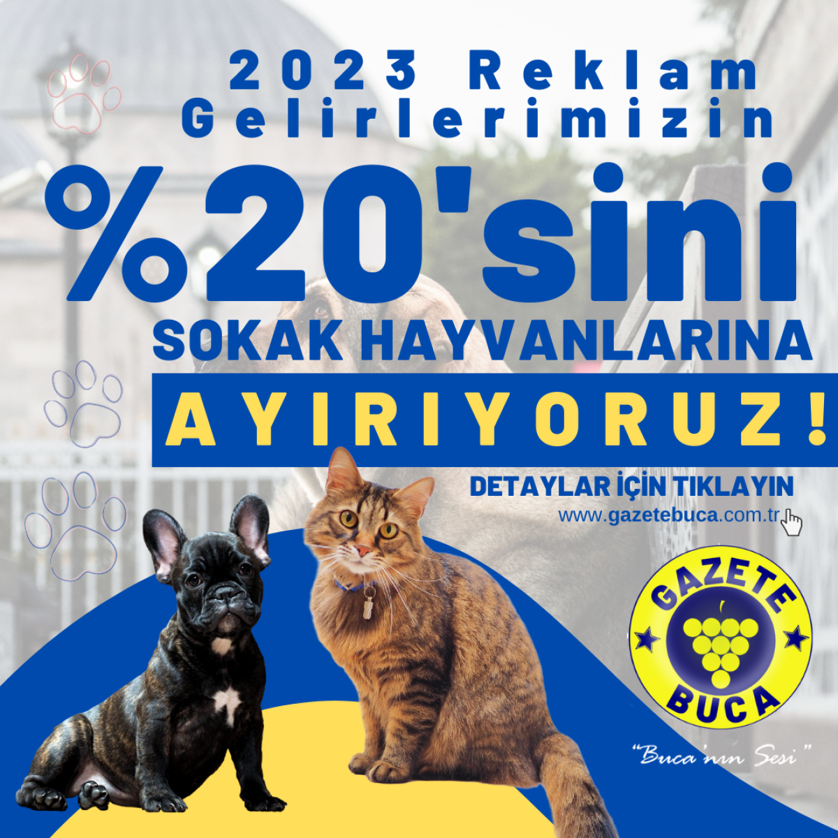 2023 yılı içerisinde Gazete Buca ailesi olarak, gelen reklam gelirlerimizin %20 'sini sokak hayvanlarımıza daha iyi bir yaşam sunmak adına bağışlıyoruz.
