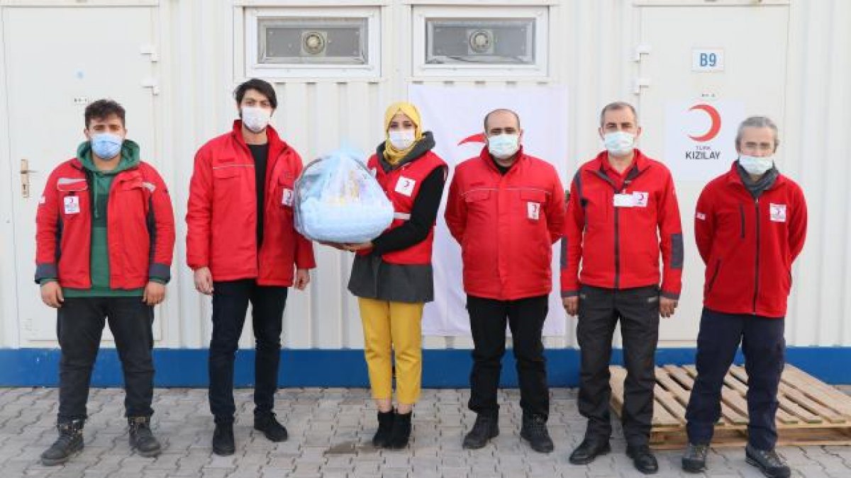 "Adnan" ismini verdikleri bebekleriyle geçici barınma merkezine dönen aileyi, Türk Kızılay ekipleri kaldıkların konteynerde ziyaret etti. Aileye içerisinde bebek kıyafeti ve yiyecek bulunan bir sepet armağan eden görevliler, bir süre Adnan bebeği sevdi.