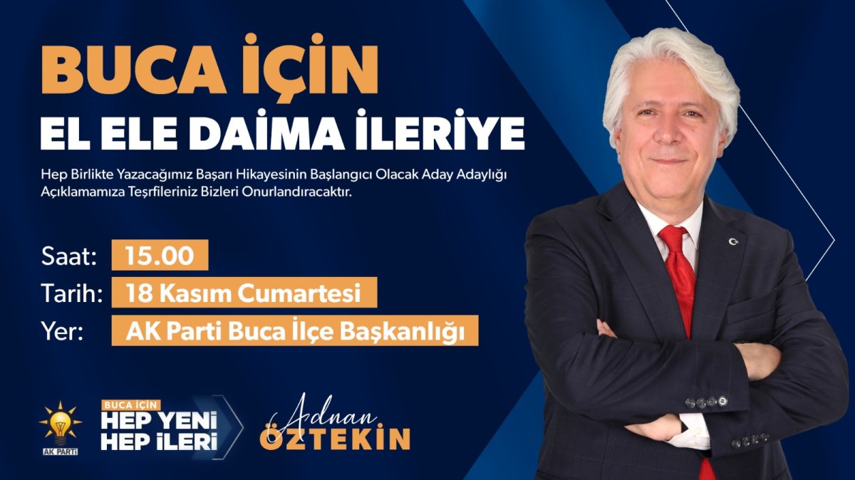 Buca Belediyesi eski meclis üyelerinden Adnan Öztekin Buca Belediye Başkan Aday Adaylığını açıklıyor. ÖZTEKİN; Kıymetli Bucalı hemşehrilerim, değerli AK Partili yol arkadaşlarım; Yaşadığımız şehrin güzelleşmesi ve kalkınması için mücadele eden bizlerin, hep birlikte yazacağımız başarı hikayesinin de başlangıcı olacak aday adaylığı açıklamamıza teşrifleriniz bizleri onurlandıracaktır.