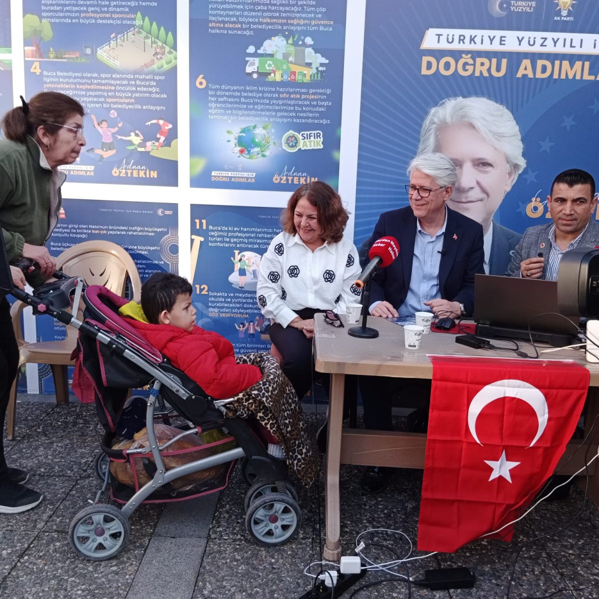 1928 Buca Gönüllülerinin standında yapılan canlı yayında sayın Adnan Öztekin büyük ilgi gördü. Yayına eşi Nurcan Öztekin ile katılan sayın Öztekin ''Yaşamın merkezinde olan kadındır. Çocuklarıyla, eşiyle. eviyle ve işiyle ilgilenen kadındır.'' diyerek ilk sözü sevgili eşine verdi. Nurcan Öztekin; '' Buca kadınları ve çocuklarıyla güçlüdür. Kadınların kalkındırılması için semt evleri kurulmalı, kadınlar yarım günde olsa Buca'nın meşhur yemekleri ile üretim yapabilir. Belediye bunları pazarlayıp halkın kalkındırılması sağlanabilir. Özel çocuklarımız için eğitim kurumları açmayı planlıyoruz. Ve yine bu çocuklarımız için oyun alanları ve parklar yapmayı planlıyoruz.'' sözlerini bitirirken engelli çocuğu olan bir anne ve çocuğu yayına katılmak istedi. Duygulu anlar yaşandı.