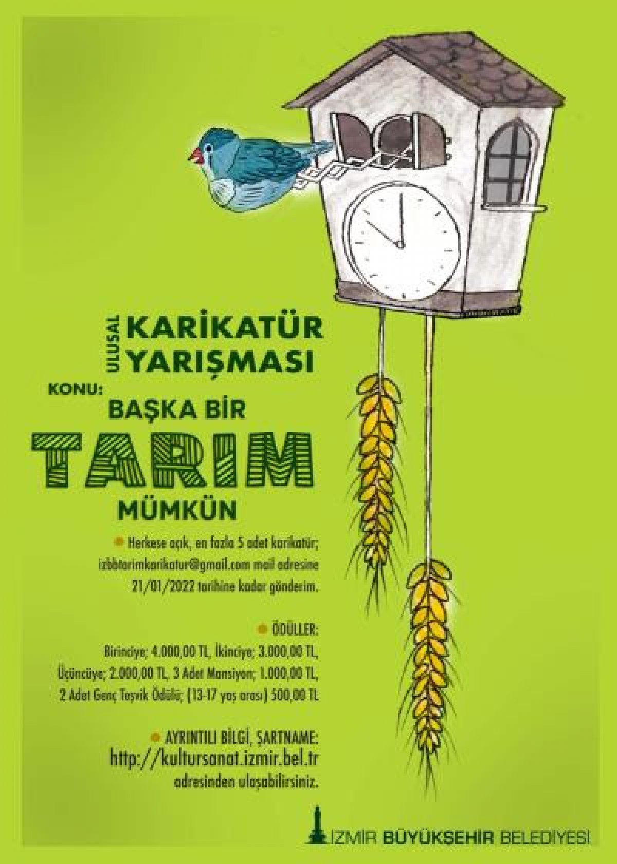 İzmir Büyükşehir Belediyesi “Başka Bir Tarım Mümkün” temasıyla ulusal karikatür yarışması düzenliyor. Başkan Tunç Soyer’in yerel tohumlar ve yerel ırkları yaygınlaştırarak kuraklıkla, küçük üreticiyi destekleyerek yoksullukla mücadele üzerine temellenen “Başka Bir Tarım Mümkün” anlayışı çizgilere konu oluyor. İklim krizi ve kuraklık tehdidine karşı toplumsal duyarlılığın güçlendirilmesinin hedeflendiği yarışmada kooperatifleşme, köy yaşamı, tarım teknolojisi, ekolojik denge, geleneksel üretim, yöresel ürünler, organik tarım, toprak ve su güvenliği, zirai sulama, yaban hayatı, gıda israfının önlenmesi gibi tarımsal üretimin alt başlıkları da işlenebilecek.