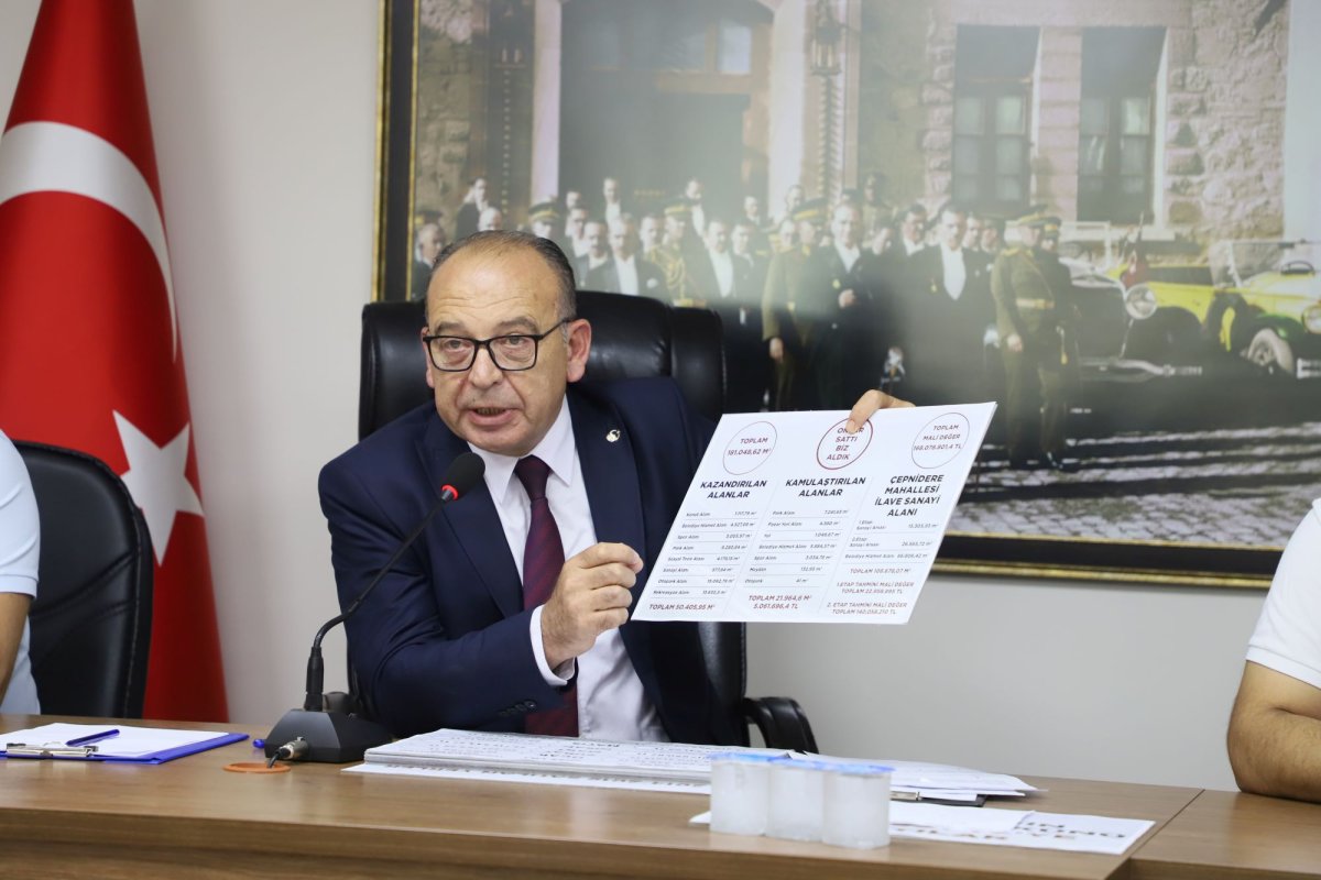 2014 -2019 yılları arasında 219 adet mülkün satıldığını söz konusu satılan yerlerin 766 bin 930 metrekare olduğunu vurgulayan Başkan Çetin Akın, “Onlar gibi hazırı satmadık, miras yemedik biz. Turgutlu Belediyesine ait 2014 - 2019 yılları arasında 219 tane mülk satılmış. Toplam metrekaresi 766 bin 930 metrekare. Ağızdan dolu dolu çıkıyor. Bu mirası yiyen adamlar, bugün Turgutlu'nun malını en iyi şekilde değerlendirdiğini inanıp imza atan adamlar, bugün imzalarını inkar ettiler. Ben ne yaptım? Bugüne kadar konut alanı, belediye hizmet alanı, spor alanı, park alanı, sosyal tesis alanı, sanayi alanı, otopark alanı, rekreasyon alanı olmak üzere toplam 50 bin 405 metrekareyi yine bizim ekibimizin becerileriyle Turgutlu Belediyesine kazandırdık. Turgutlulu hayırseverlerin katkıları ve bizim becerimiz ile 5 milyon 61 bin 696 TL ödeyerek kamulaştırmalar yaparak park alanı, pazar yeri alanı, yol, belediye hizmet alanı, spor alanı, meydan, otopark olarak da 21 bin 964 metrekareyi yine Turgutlu Belediyesine kazandırdık. Bu da yetmedi Irlamaz Rekreasyon Alanı Birinci Etapta yaptığımız imar uygulamalarından 15 bin 305 metrekare sanayi arsası, ikinci etapta yaptığımız uygulamadan 26 bin 565 metrekare sanayi arsası ve 66 bin 806 metrekare belediye hizmet alanı olmak üzere toplamda 108 bin 678 metrekareyi de bu yollarla kazandırdık. Biz, belediyemize toplam 181 bin 048 metrekare kazandırdık. Onlar 766 bin metrekare sattılar. Turgutlu Belediyesine toplam mali değeri bugün 168 milyon TL. Onların sattığı yerlerin bugünkü mali değeri ise 500 milyon TL.”