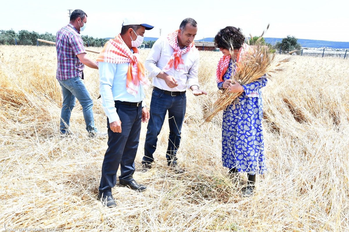 Başkan Soyer'in Menderesli üreticilere verdiği karakılçık tohumunun ilk hasadı yapıldı