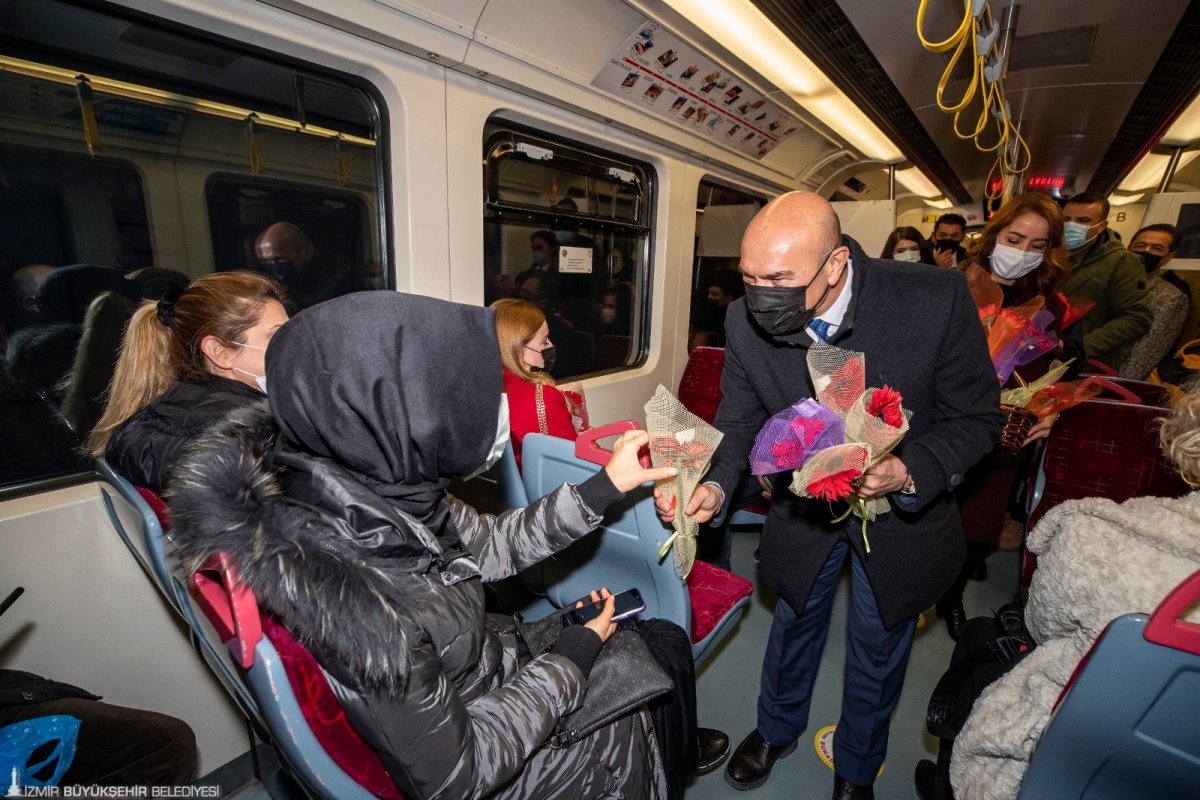 İzmir Büyükşehir Belediye Başkanı Tunç Soyer, 8 Mart Dünya Kadınlar Günü nedeniyle sabahın erken saatlerinde Karataş'taki Tarihi Asansör’ün önünde başlayarak sokakta kadınlara karanfil dağıttı. Kadın makinistler, mühendisler ve çalışanlarla birlikte Karataş'taki tramvay durağına kadar yürüyen Başkan Tunç Soyer tramvaya binerek kadın yolcuların 8 Mart’ını kutladı. Başkan Soyer, Konak'ta tramvaydan inerek İzmir Metrosu'nun Konak durağına kadar yürüdü. Metro ile Basmane istasyonuna giden Başkan Soyer metroda da kadın yolcuların gününü kutladı.