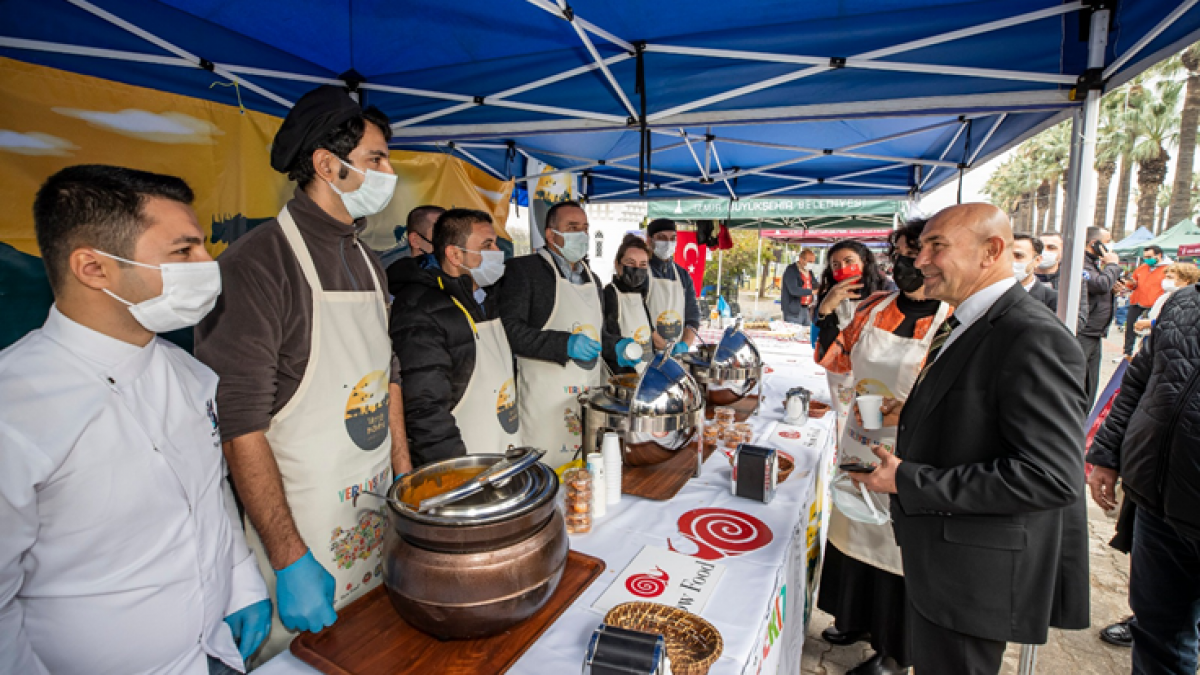 Üreticilerle sohbet eden Başkan Soyer ve eşi Neptün Soyer, stantları dolaşırken üretim yöntemleri hakkında bilgi aldı ve sağlıklı gıdanın üretici pazarlarından geçtiği vurgusunu yaptı. Başkan Soyer, İzmir Büyükşehir Belediyesi, Halkın Bakkalı, İzmir Köy Koop Birliği, Slow Food, Türkiye Aşçılar Federasyonu ve İzmir Aşçılar Derneği’nin koordinasyonunda “Yerliyse Yeriz” sloganıyla kurulan stantta ikram edilen tarhana çorbasından da içti. Buğdayından sebzesine yerli tohumlardan elde edilen ürünlerle yapılan ve ikram olarak sunulan tarhana, pazar ziyaretçilerinin de uğrak noktası oldu.