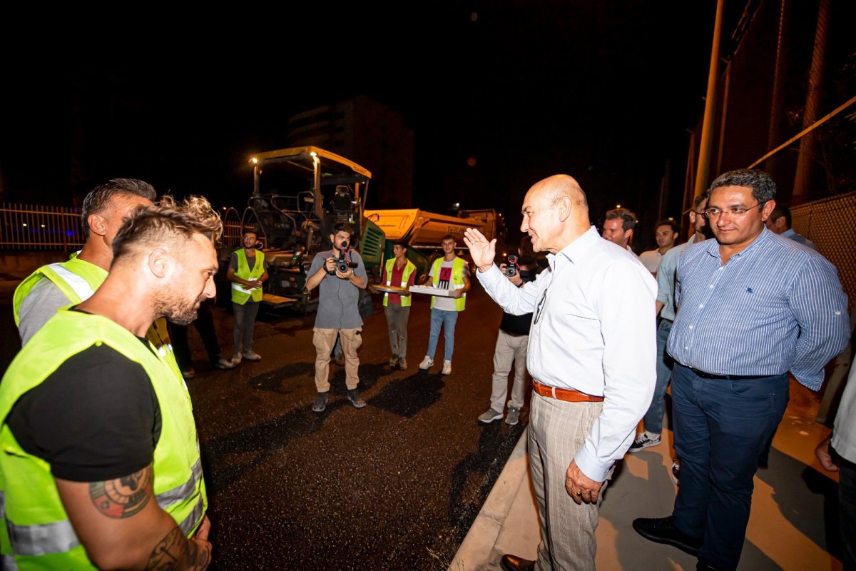 İzmir Büyükşehir Belediye Başkanı Tunç Soyer, “İZBETON ve Fen İşleri Dairesi Başkanlığı çalışanlarıyla beraber Bayraklı’da yaklaşık 5,5 kilometrelik bir güzergâhta sıcak asfalt çalışması yapıyoruz. İzmirlilerin en yoğun kullandığı caddeler olduğu için gündüz trafiğe kapatmadan sadece gece mesai yaparak çalışmayı tamamlamayı planlıyoruz. Burada görev yapan herkesle iftihar ediyoruz. Sıcak bir yandan, gece koşulları bir yandan canla başla çalışıyorlar. İzmirliye konforlu bir ulaşım hizmeti sunmak için heyecanla çalışmayı sürdürüyoruz” diye konuştu.