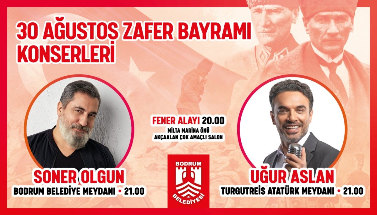Zafer Bayramı için düzenlenen etkinlikler, 30 Ağustos Çarşamba günü saat 09.30'da Bodrum Atatürk Heykeli önünde Çelenk Sunma Töreni ile başlayacak. Etkinlikler, saat 20.00'de Milta Marina’dan Belediye Meydanına Seymenler Eşliğinde Kortej ile devam edecek. Bodrum Belediye Meydanında Sunucu Ateş’in sunumuyla Seymenler Gösterisi ardından saat 21.00’de Soner Olgun Konseri gerçekleştirilecek.
