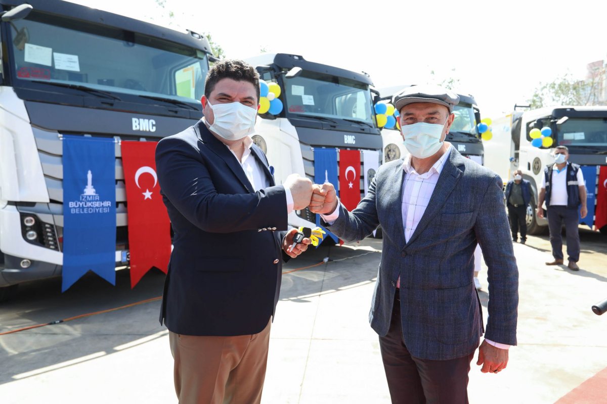 Konuşmaların ardından Başkan Soyer, ilk etapta temizlik işlerine getirilen 15 çöp kamyonunun