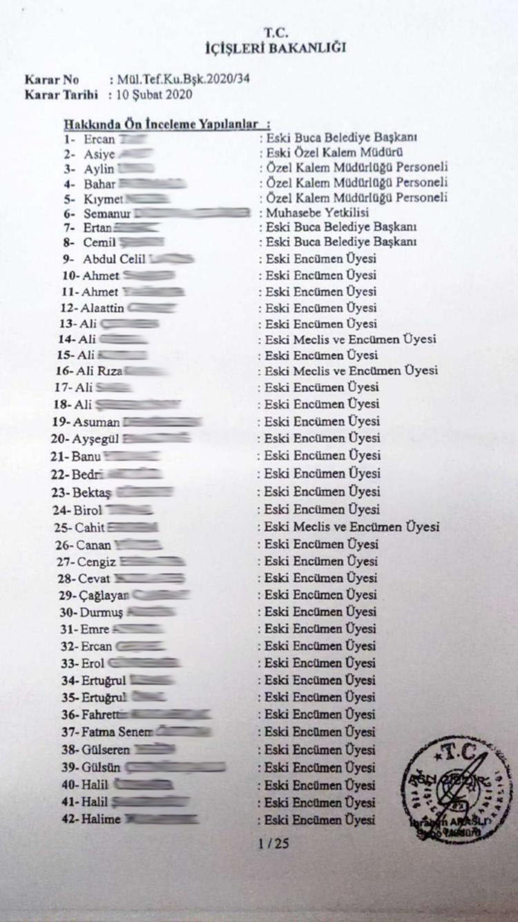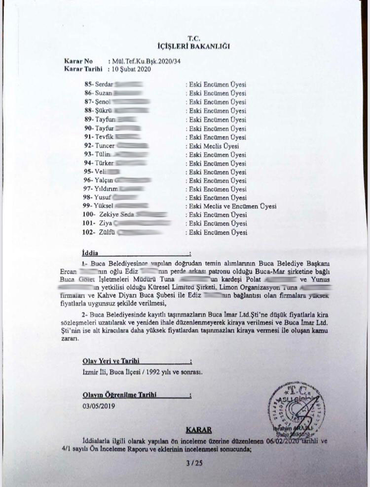 1992 sonrası işlemlerin konu edildiği ön soruşturmada olayların öğrenildiği tarih olarak belirtilen tarih 03/05/2019 olarak belirtiliyor. Ertan Erdek, Cemil Şeboy ve Ercan Tatı dönemlerinin mercek altına alındığı incelemede Levent Piriştina dönemine ait bir bilgi yer almıyor. Erdek, Şeboy ve Tatı’yla birlikte onların dönemlerine görev alan Encümen üyelerinin de tek tek isimleri belirtilerek alınan karara göre haklarına soruşturmaya izin verilip verilmediği vurgulanıyor. Buca Belediyesi’ne ait 7 taşınmazın Buca İmar şirketi tarafından alt şirketlere daha yüksek bedelle kiralanması nedeniyle kamu zararı oluştuğu yönündeki iddiayla ilgili olarak 4 taşınmazla ilgili kararlarda soruşturmaya gerek yok denirken, 3 taşınmazla ilgili kararlara imza atan isimler hakkında soruşturma izni verildiği gözleniyor.
