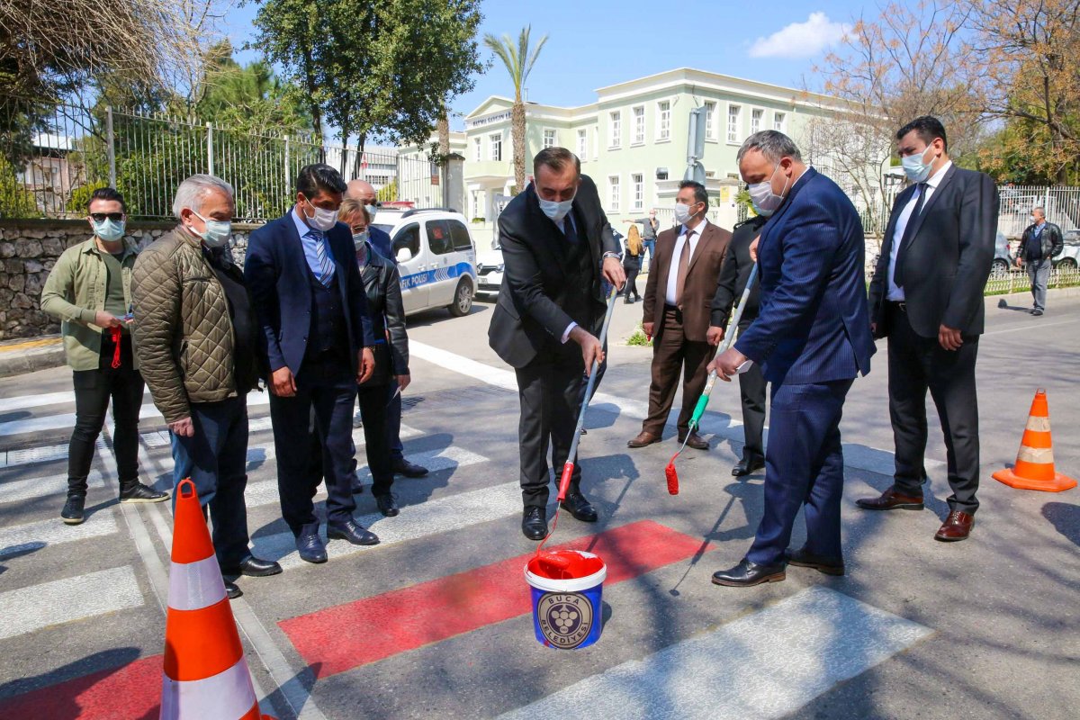 yaya geçitlerine projenin sembolü olan kırmızı çizgi çekildi. Buca Kaymakamı Mahmut Nedim Tunçer,