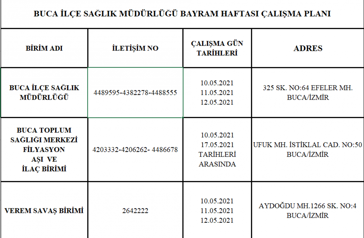 Buca İlçe Sağlık Müdürlüğüne bağlı aşağıdaki birimler vatandaşın mağdur olmaması açısından çalışmalara devam etmektedir.
