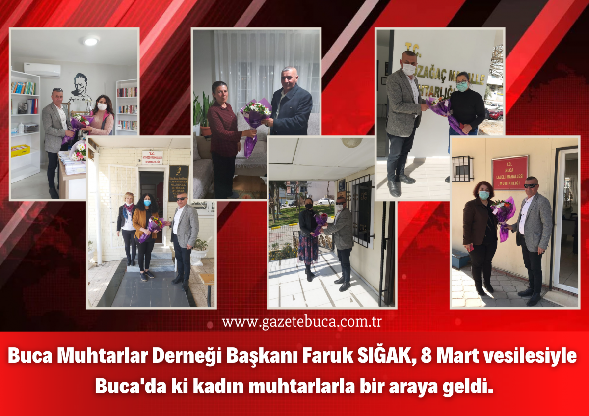 Buca Muhtarlar Derneği Başkanı Faruk SIĞAK, 8 Mart vesilesiyle Buca'da ki kadın muhtarlarla bir araya geldi. Kadın muhtarları bu anlamlı günde unutmayan Faruk Sığak, muhtarlarla bir araya gelerek hem sohbet etti hemde onlara çiçek hediye etti. Sadece 8 Mart'ta değil her gün kadınları desteklememiz gerektiğini söyleyen Faruk SIĞAK tekrar gönüllerde taht kurdu.