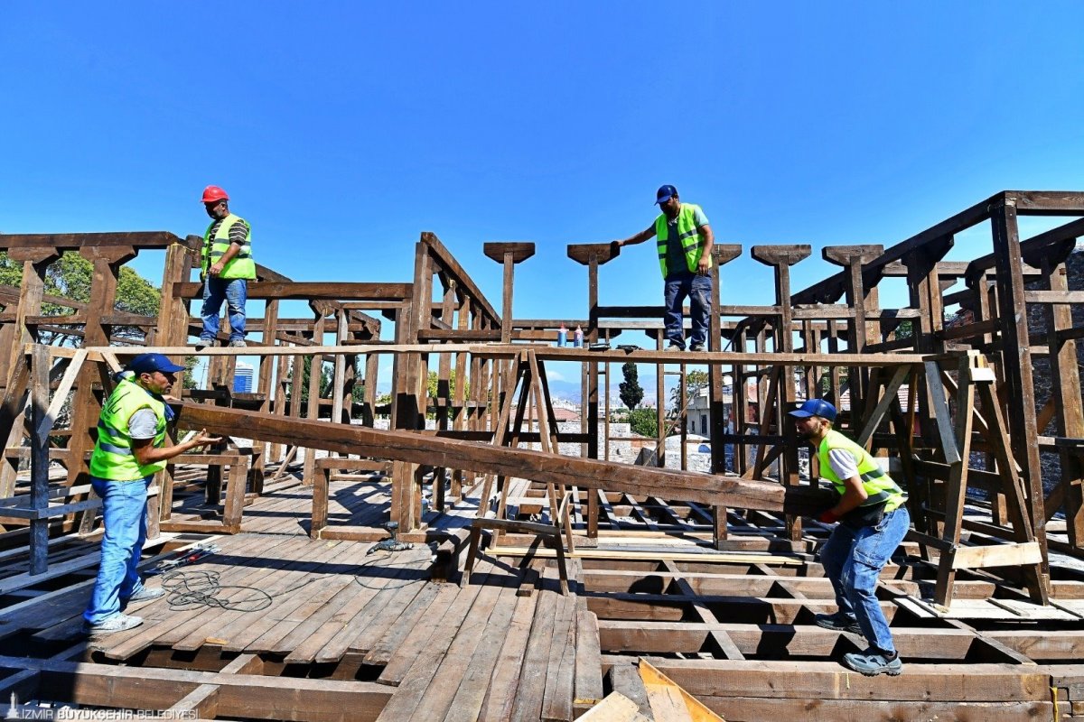 Carfi Konağı’nın restorasyon çalışmaları hakkında bilgi veren İzmir Büyükşehir Belediyesi Tarihi Yapılar Şube Müdürlüğü’nde görevli İnşaat Mühendisi Tuğçe Gümürçinler, “Konak, 940 metrekarelik bahçe içinde yer alıyor. 19. Yüzyıl’dan kalma iki katlı konaktan günümüze sadece bir duvar ve müştemilat yapılarından da bir hamam yapısı ulaşıyor. Biz konağın özgün dokusuna sadık kalarak başlattığımız restorasyon çalışmalarında işin yüzde ellisini tamamladık. Bodrum katta taş duvar imalatları ve kazı çalışmalarında tespit edilen tonozlu mekanın restorasyonu tamamlandı. Zemin katın ahşap karkası tamamlandı, birinci kat ahşap karkas imalatı sürüyor. Eski hamamın duvarı tamamlandı, kubbe imalatına başlandı. Bahçe sınırında bulunan taş duvarların yapımı devam ediyor" dedi.