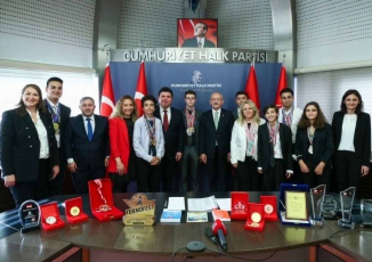 Buca Belediye Başkanı Erhan Kılıç, uluslararası yarışmalarda aldığı madalyalarla ülkemize büyük bir gurur yaşatan Buca Belediyesi Kızılçullu Bilim ve Sanat Merkezi’nin öğretmen ve öğrencileri ile beraber CHP Genel Başkanı Kemal Kılıçdaroğlu’nu makamında ziyaret etti.