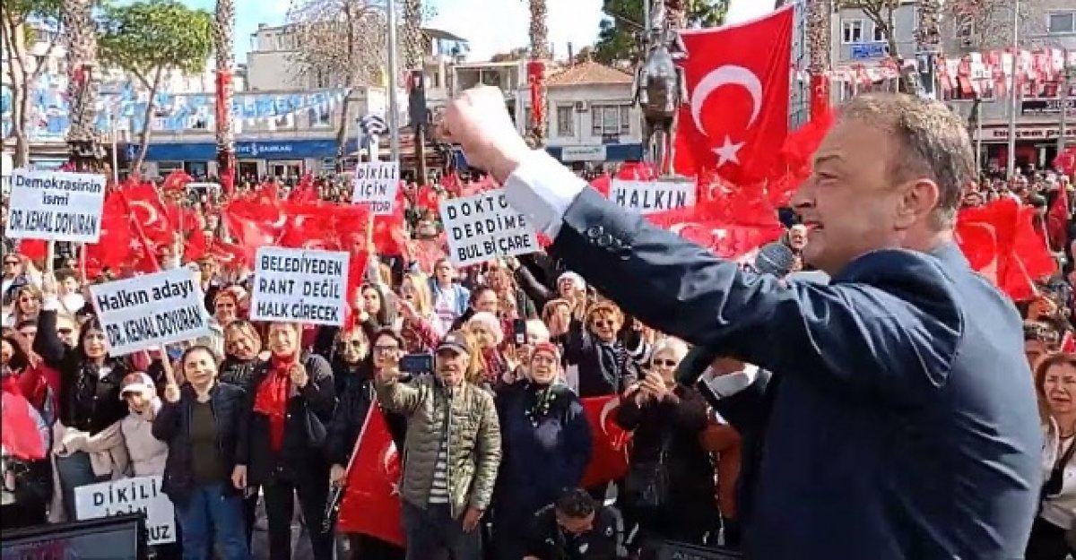 Dikili'den Bağımsız Belediye Başkan Adayı olan Kemal Doyuran, bugün kent merkezinde bulunan Atatürk Meydanı'nda yurttaşlarla buluştu. Alanı dolduran Doyuran’ın yurttaşlar ellerinde Türk bayrakları ve “Belediyeden rant değil, halk girecek”, “Halkın iradesi satın alınamaz”, “Çare doktor”, “Halkın adayı Kemal Doyuran” yazılı dövizler taşıdı.