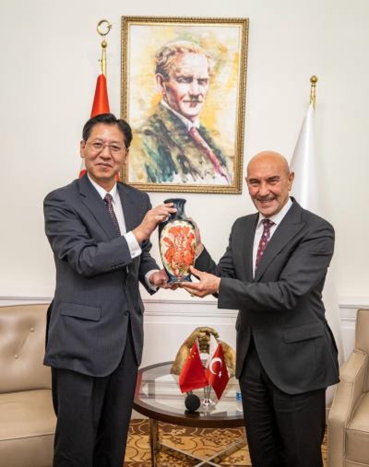 Çin Halk Cumhuriyeti’nin Ankara Büyükelçisi Liu Shaobin, İzmir Büyükşehir Belediye Başkanı Tunç Soyer’i ziyaret etti. İzmir’e ilk kez geldiğini söyleyen Büyükelçi Liu Shaobin, Başkan Soyer’in iki ülkenin yerel yönetimleri arasındaki ilişkilerin güçlendirilmesi için girişimlerinin bulunduğunu ve bundan mutluluk duyduğunu ifade etti. Liu Shaobin, “Çin ve Türkiye önemli bir kültürel mirasa sahip. Çin ve İzmir arasında somut işbirlikleri yapılabilir. Biz, Çinli turistlerin İzmir’e gelmesi için çalışacağız. Ayrıca Çinli şirketleri İzmir’de iş yapmaları için teşvik edeceğiz” dedi.