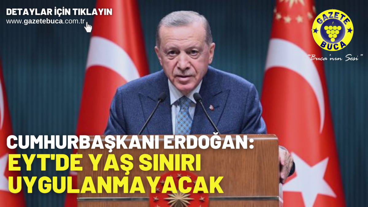 Cumhurbaşkanı Recep Tayyip Erdoğan, emeklilikte yaşa takılanlar (EYT) düzenlemesine ilişkin, "Bugün sizlerle paylaşacağımız düzenlemeyle yaklaşık 2 milyon 250 bin vatandaşımız daha emekli olma hakkına kavuşuyor. Emeklilik hakkının kullanılması hususunda herhangi bir yaş sınırı uygulanmayacaktır" dedi.