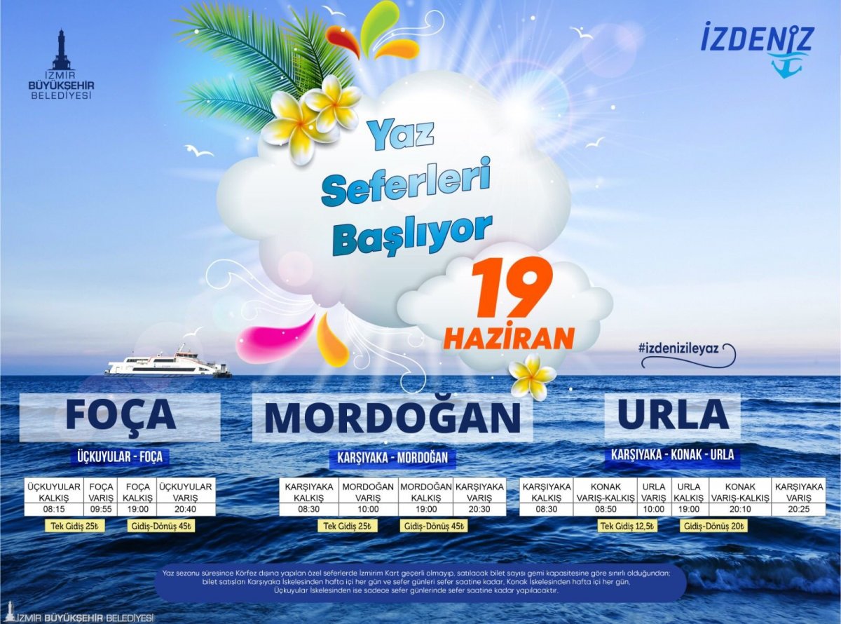 İzmir Büyükşehir Belediyesi İZDENİZ Genel Müdürlüğü; Foça, Mordoğan ve Urla’ya hafta sonu yaz seferlerini 19 Haziran Cumartesi gününden itibaren başlatıyor. Karşıyaka-Konak-Urla; Üçkuyular-Foça ve Karşıyaka-Mordoğan güzergâhlarındaki seferler, pandemiyle mücadele kapsamındaki kısıtlamaların devam etmesi nedeniyle öncelikle yalnızca cumartesi günleri yapılacak. Kısıtlamalar sona erdiğinde pazar günleri de seferler olacak.