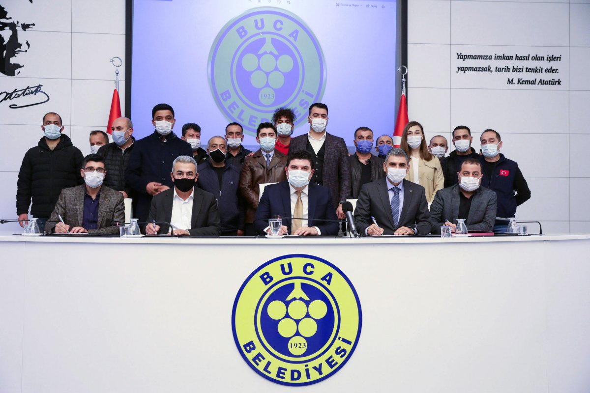 Buca Belediyesi ile DİSK (Devrimci İşçi Sendikaları Konfederasyonu) Genel İş Sendikası 5'nolu Şube arasında şartları kabul edilen Toplu İş Sözleşmesi’nin imza töreni gerçekleştirildi.