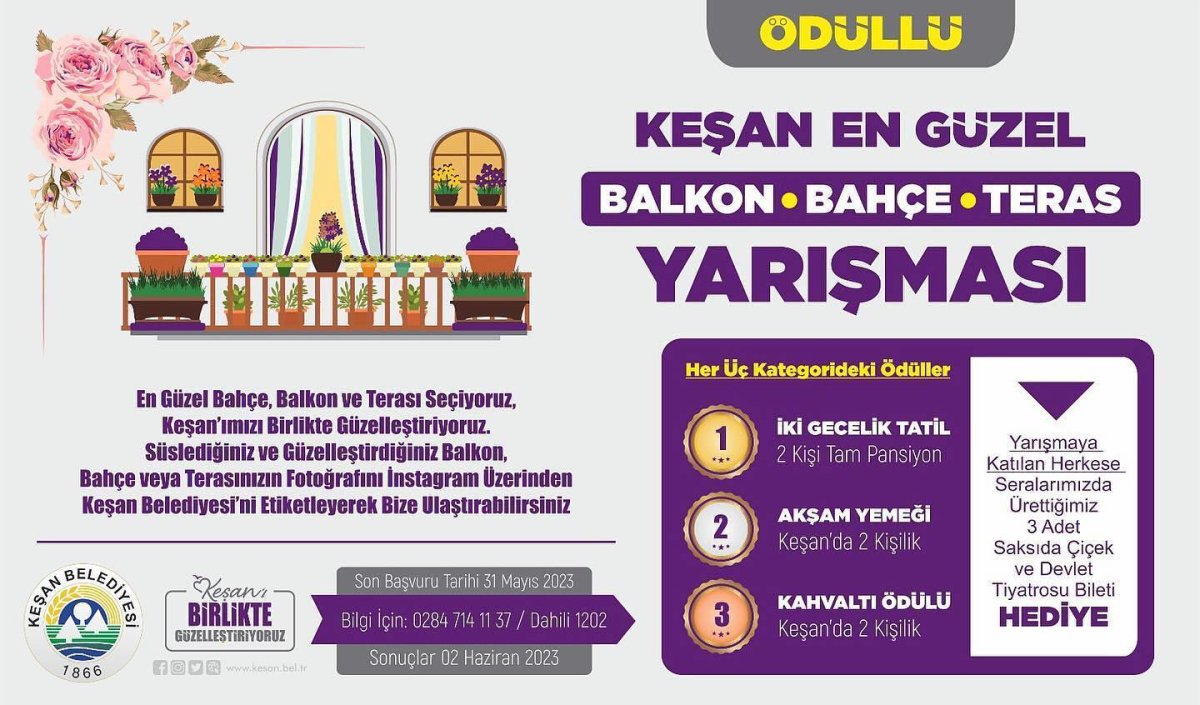 Yarışmaya başvuruların 31 Mayıs 2023 Çarşamba günü sona ereceği kaydedildi. “Keşan En Güzel Bahçe, Balkon ve Teras Yarışması”na vatandaşların rengarenk balkon, bahçe