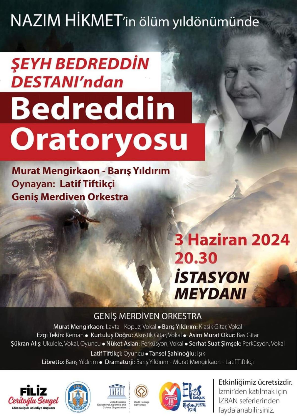 Türk şiirini dünyaya tanıtan, 50’den fazla dile çevrilen şiirleri ve geride bıraktıklarıyla bir şairden fazlası olan Büyük Usta Nazım Hikmet, ölümünün 61. yıl dönümünde Efes Selçuk’ta “Bedreddin Oratoryosu” ile anılacak. Ünlü şairin anısına düzenlenen etkinlik, 3 Haziran Pazartesi günü saat 20.30’da İstasyon Meydanı’nda gerçekleşecek. Geniş Merdiven Orkestrası tarafından sahnelenecek olan Nazım Hikmet’in ölümsüz eseri “Şeyh Bedreddin Destanı”ndan uyarlanmış “Bedreddin Oratoryosu”, O’nun eserinde işlediği temaları ve tarihi anlatımları müzikle buluşturacak.