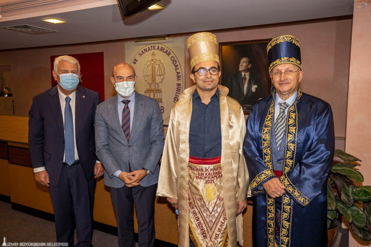 İzmir Esnaf ve Sanatkarlar Odaları Birliği Başkanı Zekeriya Mutlu ise Başkan Tunç Soyer’e pandemi döneminde esnafa olan katkısından dolayı teşekkür ederek “Bizlere sahip çıkmanız çok değerli. İyi ki varsınız. Birlikte ahilik felsefesini yaşatmak için çaba sarf edeceğiz. Ahiliğin unutulmaması için elimizden geleni yapacağız” dedi. Başkanlık makamındaki ziyarete ayrıca İzmir Vali Yardımcısı Hikmet Dengeşik, İzmir İl Ticaret Müdürü Şahin Ersü, İESOB Yönetim Kurulu üyeleri ve bu senenin ahisi Ali Sabri İlkmen ve kalfası Yakup Kaplan da katıldı.