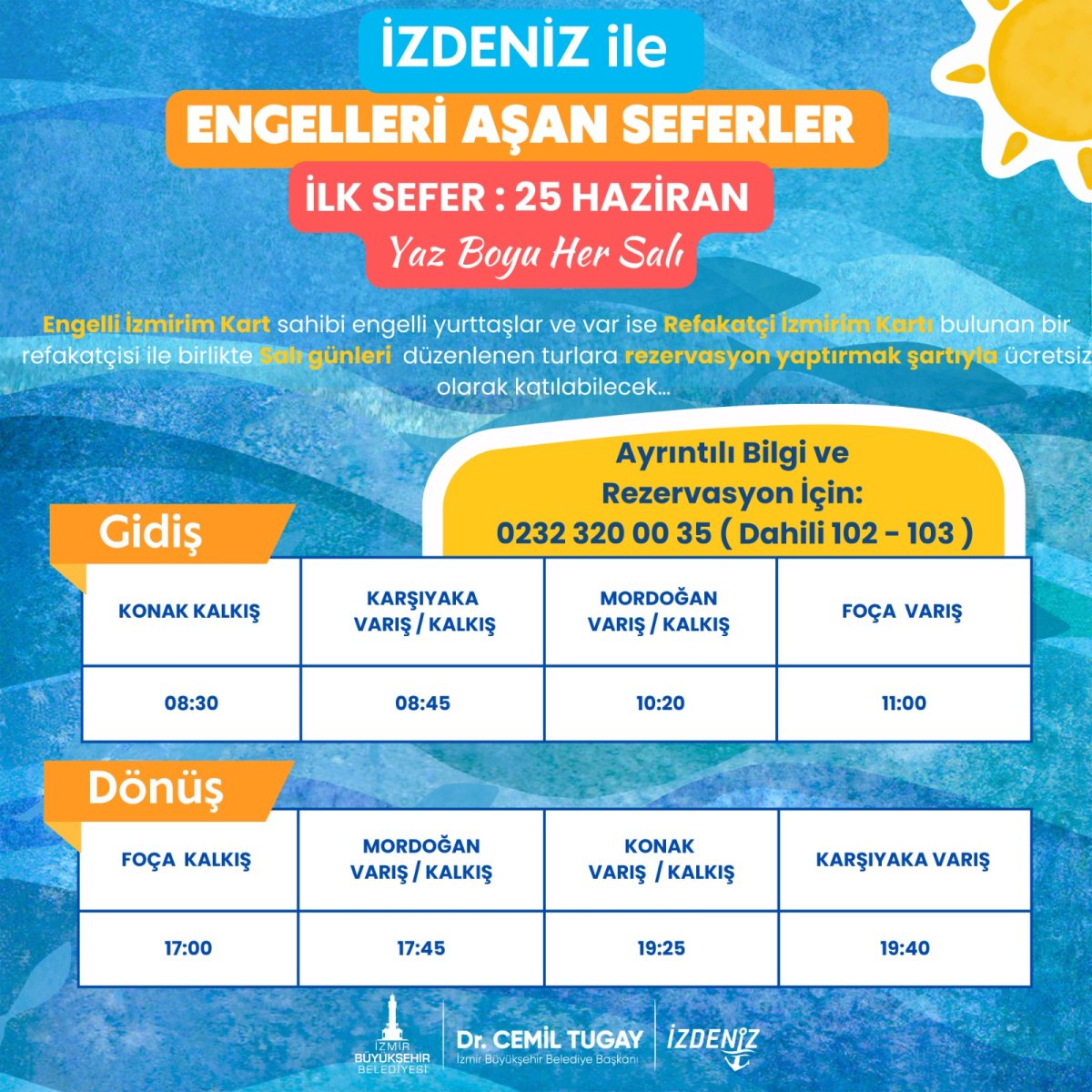 Salı günleri Konak’tan kalkacak gemi Karşıyaka İskelesi’ne uğrayıp Mordoğan'a, sonrasında ise Foça’ya varacak. Günü Mordoğan ve Foça’da geçirecek engelli yurttaşlar ve refakatçileri, akşamüstü aynı güzergâhla geri dönecek. Salı günleri Konak’tan 08.30’da kalkacak gemi, 08.45'te Karşıyaka'da, 10.00’da Mordoğan’da olacak. 10.20'de Mordoğan'dan hareket ederek 11.00'de Foça’ya ulaşacak. İlk sefer 25 Haziran Salı günü başlayacak.