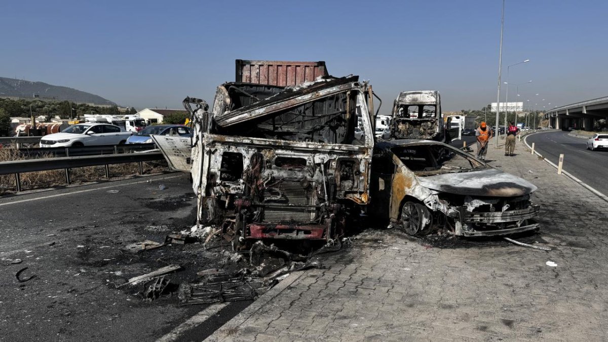 İzmir'de tır, minibüs ve otomobilin çarpışarak yanması sonucu 5 kişi yaralandı