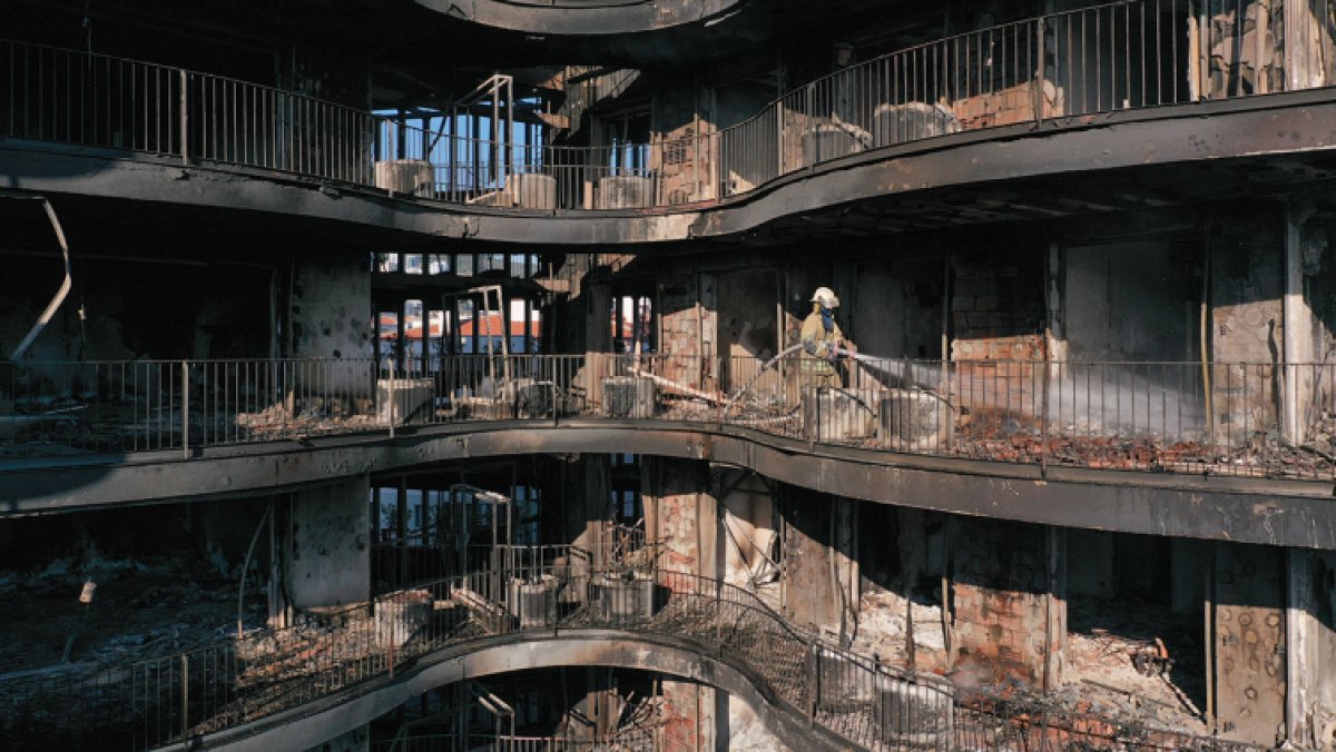 Yangının ardından 8 katlı blok büyük ölçüde hasar gördü, daireler kullanılamaz hale geldi.