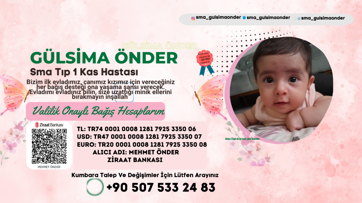 17.04.2023'de İzmir'in Karabağlar ilçesi Yunus Emre Mahallesinde doğan Gülsima Önder'in 18 günlükken SMA TIP KAS hastası olduğu öğreniliyor. Yurt dışında gen tedavisi olması için 60 Milyon tl ye ihtiyaç vardır. Ailenin maddi durumu bunu karşılamaya yetmediği için yardıma ihtiyaçları vardır.