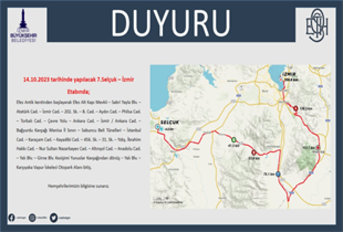 Bu kapsamda, 14 Ekim 2023 Cumartesi günü yarış saatlerinde 7. Selçuk - İzmir Etabı kapsamında Efes Antik Kenti’nden başlayarak Efes Alt Kapı Mevkii, Sabri Yayla Bulvarı, Atatürk Caddesi, İzmir Caddesi, 202 Sokak, 8. Cadde, Aydın Caddesi, Philsa Caddesi, Torbalı Caddesi, Çevre Yolu, Ankara Caddesi, İzmir/Ankara Caddesi, Bağyurdu Kavşağı Manisa il sınırı, Sabuncubeli Tünelleri, İstanbul Caddesi, Karaçam Caddesi, Kayadibi Caddesi, 456 Sokak, 31 Sokak, Yüzbaşı İbrahim Hakkı Caddesi, Nur Sultan Nazarbayev Caddesi, Altınyol Caddesi, Anadolu Caddesi, Yalı Bulvarı, Girne Bulvarı kesişimi Yunuslar Kavşağı’ndan dönüş, Yalı Bulvarı, Karşıyaka Vapur İskelesi Otopark alanı güzergahları bölünmüş yollarda gidiş yönünde sağ şeridin; bölünmemiş yollarda yolun tamamının araç ve yaya emniyetini sağlayacak gerekli tüm önlemler alınarak etaplar halinde araç trafiğine kapatılacak.