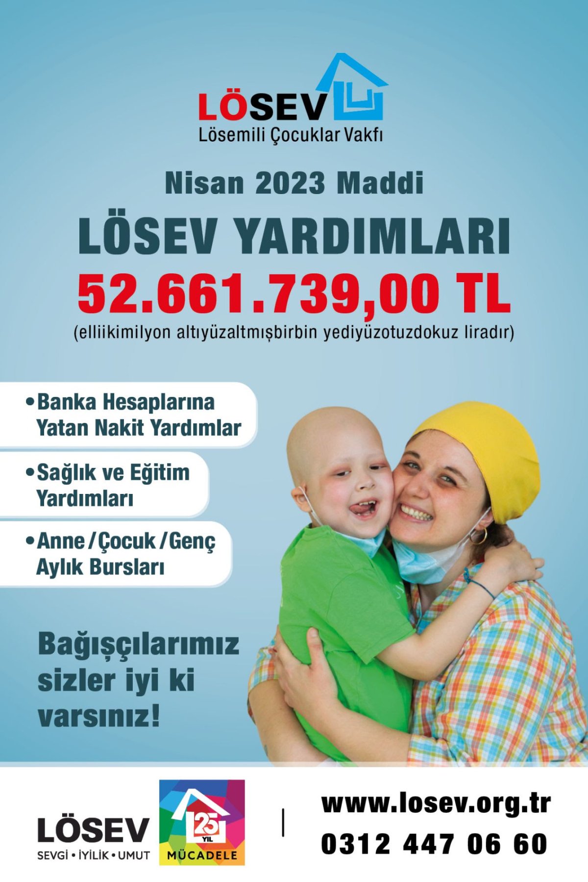 başta olmak üzere 25 yıldır desteklerimizi iletmeye devam ediyoruz. Tüm Türkiye genelinde 72.847 hastamıza ulaşırken sadece Nisan ayında 52.661.739,00 TL lösemili çocuklarımıza ve ailelerine ulaştırdık.