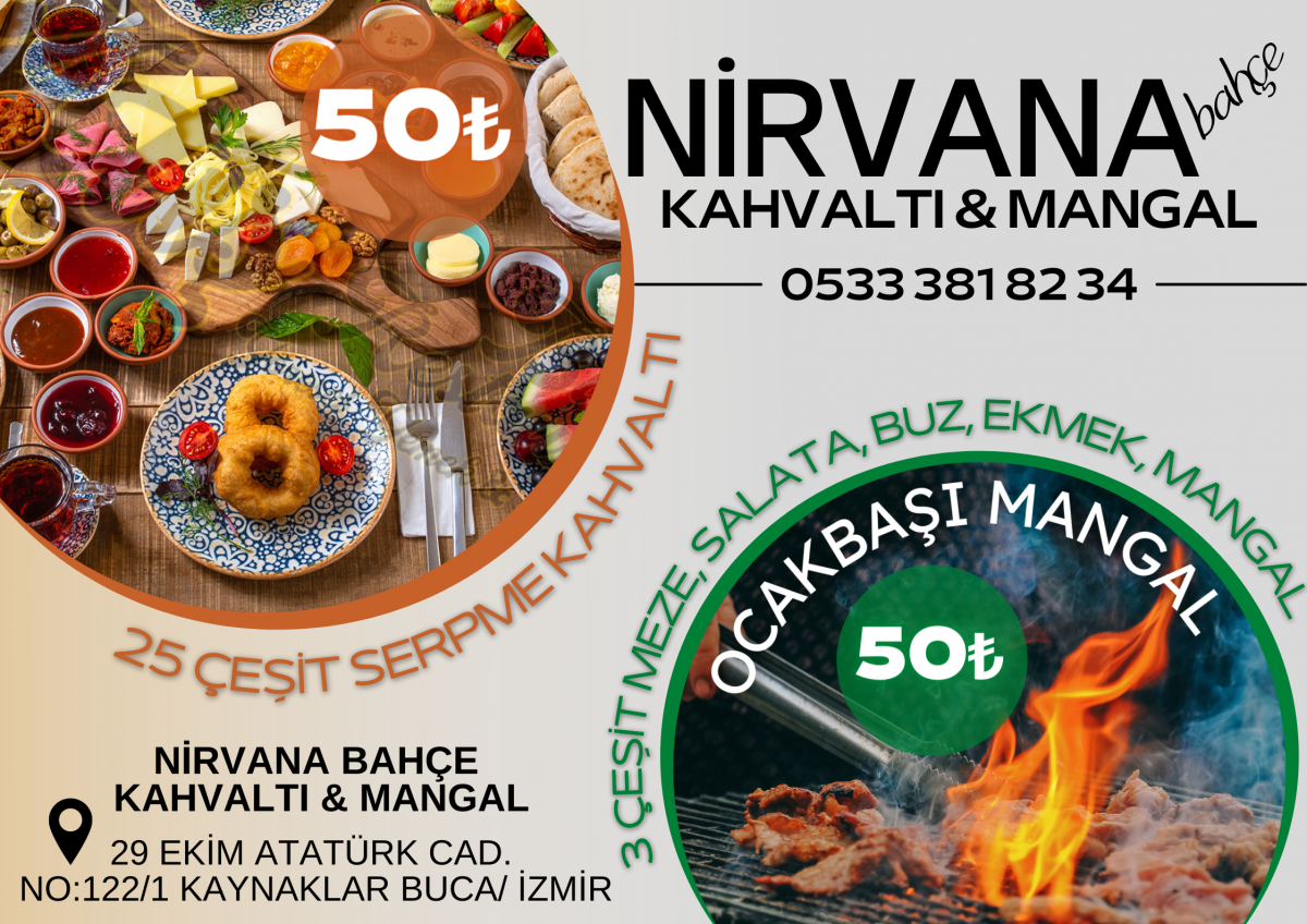 NİRVANA BAHÇE KAHVALTI & MANGAL BUCA KAYNAKLARDA AÇILDI FİYAT ŞAHANE YEMEK ŞAHANE 25 ÇEŞİT SERPME KAHVALTI 50 TL 3 ÇEŞİT MEZE,SALATA,SU,BUZ,EKMEK,MANGAL 50 TL NİRVANA BAHÇE KAHVALTI & MANGAL BUCA KAYNAKLARDA AÇILDI 0533 381 82 34