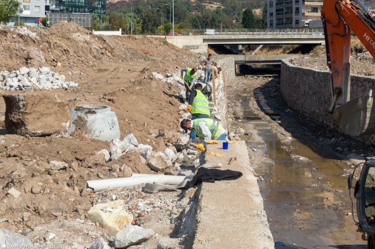 İzmir’de kent sınırları içerisinde kalan tüm derelerde doğa merkezli bir yaklaşımla çalışmalarını sürdüren İZSU, Örnekköy Bostanlı Deresi’ni ekolojik dengeyle uyumlu bir proje ile ıslah ediyor. Dere alanı içerisinde yapılan hidrolik çalışmaların ardından ekonomik ömrünü yitirmiş dere kenar yapıları yenilenerek bin 300 metrelik doğal geçirimli taş duvar yapılıyor.
