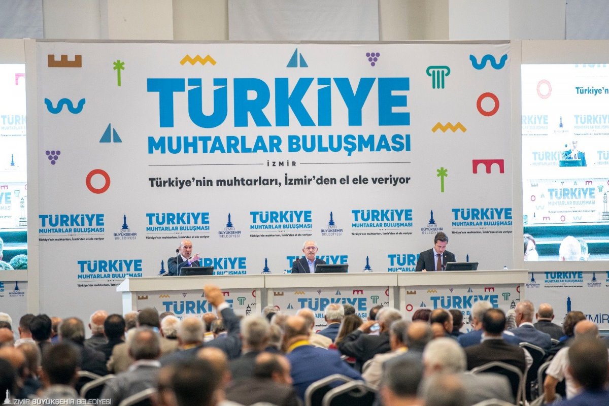 İzmir Büyükşehir Belediyesi’nin düzenlediği “Türkiye Muhtarlar Buluşması”nda muhtarların yerel siyaset yapma sürecinde karşılaştığı sorunlar belirlendi ve çözüm önerileri geliştirildi. Türkiye’nin her ilinden muhtarın bir araya geldiği buluşmanın değerlendirme toplantısı Cumhuriyet Halk Partisi (CHP) Genel Başkanı Kemal Kılıçdaroğlu’nun katılımıyla Fuar İzmir’de yapıldı. Buluşmaya İzmir Büyükşehir Belediye Başkanı Tunç Soyer, Ardahan Belediye Başkanı Faruk Demir, CHP Genel Başkan Yardımcısı Oğuz Kaan Salıcı, CHP Genel Sekreteri Selin Sayek Böke, CHP PM Üyesi Rıfat Nalbantoğlu ve Devrim Barış Çelik, CHP İzmir Milletvekilleri Ednan Arslan, Mahir Polat, Atilla Sertel, Bedri Serter, Murat Bakan, Özcan Purçu, Kani Beko, Tuncay Özkan, Tacettin Bayır, İzmir Büyükşehir Belediye Başkan Vekili Mustafa Özuslu, CHP İzmir İl Başkanı Deniz Yücel ilçe belediye başkanları, İzmir Büyükşehir Belediyesi bürokratları, meclis üyeleri, parti üyeleri ve yaklaşık 2 bin muhtar katıldı.