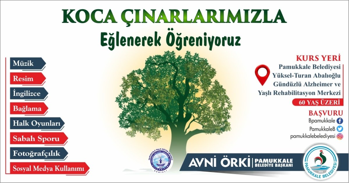 Pamukkale Belediyesi vatandaşlara yönelik sosyal projelerine bir yenisini daha ekleyerek, 60 yaş üzeri tüm vatandaşlara yönelik kurslar açıyor. Mayıs ayında açılışını gerçekleştirdiği Pamukkale Belediyesi Yüksel-Turan Abalıoğlu Gündüzlü Alzheimer ve Yaşlı Rehabilitasyon Merkezi’nde Alzheimer hastalığı ile mücadele eden vatandaşlar ile ailelerine hizmet verilmeye başlandı. Bunun yanında aynı merkezde “Koca Çınarlarımızla eğlenerek öğreniyoruz” sloganıyla çeşitli kurslar açılacak. 60 yaş üzeri vatandaşların katılacağı, müzik, resim, İngilizce, bağlama, halk oyunları, sabah sporu, fotoğrafçılık ve sosyal medya kullanımı kurslara başvurular başladı.