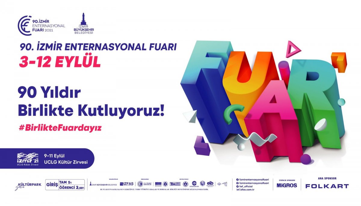 Türkiye Cumhuriyeti’nin ekonomik ve kültürel alandaki kalkınma hamlesinin öncü adımlarından İzmir Enternasyonal Fuarı, bir kez daha dünyayla buluşmaya hazırlanıyor. Fuar bu yıl 90’ıncı kez İzmir Büyükşehir Belediyesi ev sahipliğinde, İZFAŞ tarafından düzenlenecek. 3 – 12 Eylül tarihleri arasında açık kalacak fuarın ana sponsoru Folkart, etkinlik sponsoru ise Migros oldu. Pandemi nedeniyle sağlık önlemlerinin üst düzeyde olacağı İzmir Enternasyonal Fuarı’nda temalar “90 Yıldır Birlikte Kutluyoruz” ve “Geleceği İzmir'de Birlikte Kuruyoruz” olarak belirlendi. Uluslararası ticaretin en önemli buluşmalarından İzmir İş Günleri de bu yıl yedinci kez iş dünyasını online olarak buluşturacak. Fuar ile önemli bir buluşma da İzmir'de yapılacak. Birleşmiş Kentler ve Yerel Yönetimler Teşkilatı (UCLG) Kültür Zirvesi’nin dördüncüsü, fuar ile eş zamanlı olarak İzmir’de düzenlenecek. Dünyanın dört bir yanından kültür temsilcileri, zirve kapsamında 9 – 11 Eylül'de İzmir’de buluşarak kültür politikalarına ilişkin deneyimlerini paylaşacak.