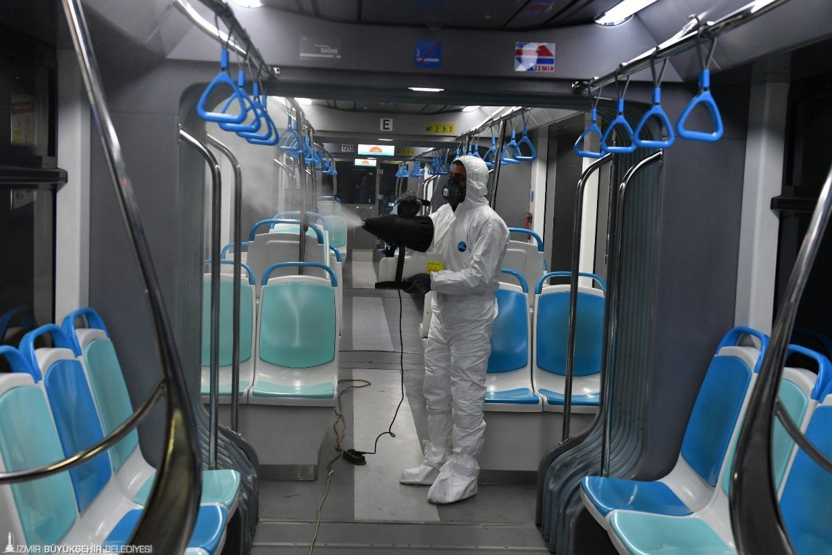 ESHOT ve İZULAŞ otobüsleri, hem seferlerden sonra hem de gün sonunda garajlarda, insan ve çevre sağlığına zararı bulunmayan su bazlı temizlik ürünleri ile virüslerden ve bakterilerden arındırılıyor. Metro vagonları Fahrettin Altay İstasyonu’nda; Karşıyaka Tramvay araçları Alaybey Durağı’nda ve Konak Tramvay araçları da Halkapınar Durağı’nda, her seferden sonra ve gün sonunda en ince ayrıntısına kadar dezenfekte ediliyor. İZDENİZ’de de yolcu gemileri, araba vapurları ve iskeleler, gün içinde sürekli temizleniyor. Gün sonunda da tüm gemiler ve iskeleler, gece vardiyasında görev yapan temizlik personeli tarafından dezenfekte edilip ertesi güne hazırlanıyor. TCDD-Büyükşehir ortaklığıyla işletilen İZBAN tren setleri ile istasyonlar, her gün rutin detaylı temizliğin yanı sıra düzenli olarak dezenfekte ediliyor. Teması azaltmak için tren seti kapıları otomatik açılıyor.