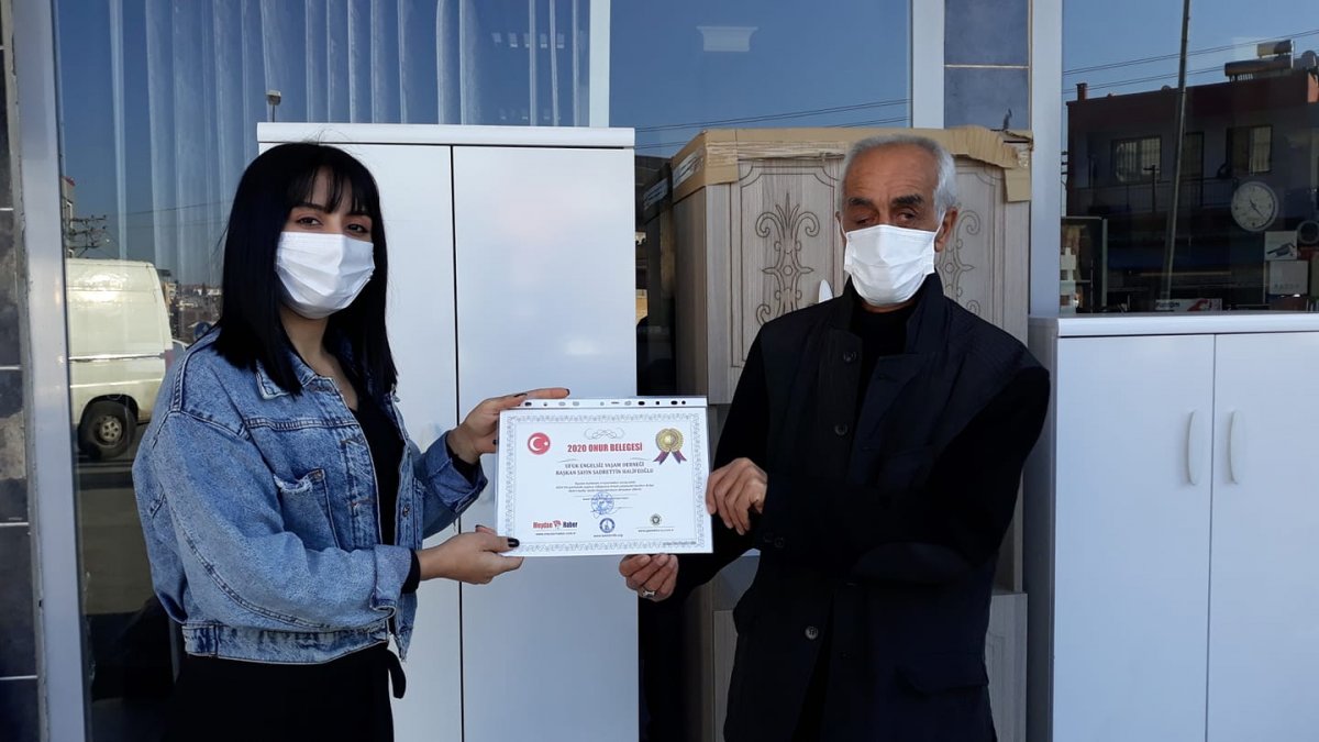 Ufuk Engelsiz Yaşam Derneği Başkanı Sadrettin Halifeoglu'na ödülünü takdim ettik.