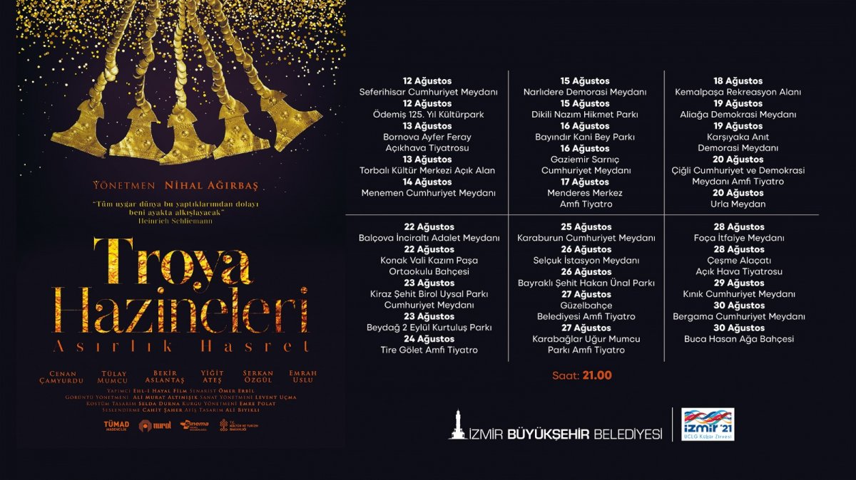 İzmir Büyükşehir Belediyesi’nin bu yıl 9-11 Eylül 2021 tarihleri arasında ev sahipliği yapacağı UCLG Kültür Zirvesi’nin heyecanı şehri sardı. Başkan Tunç Soyer’in Kültür Zirvesi’ni kentin her köşesine yayma anlayışı doğrultusunda “Troya Hazineleri Asırlık Hasret” belgeseli 30 ilçede İzmirlilerle buluşuyor.